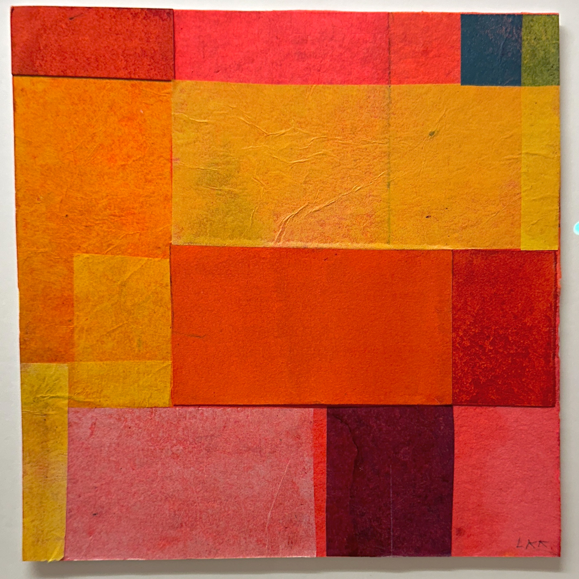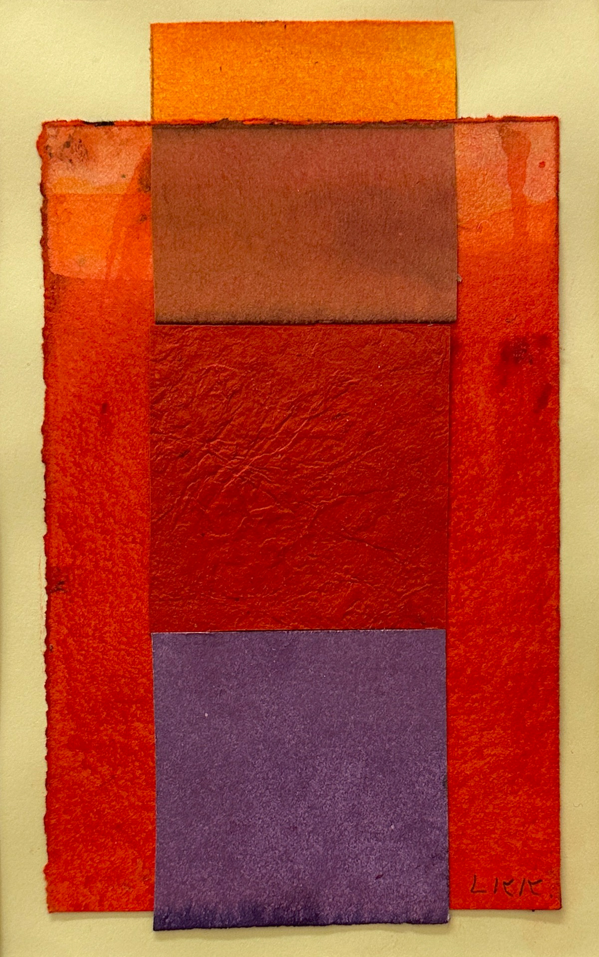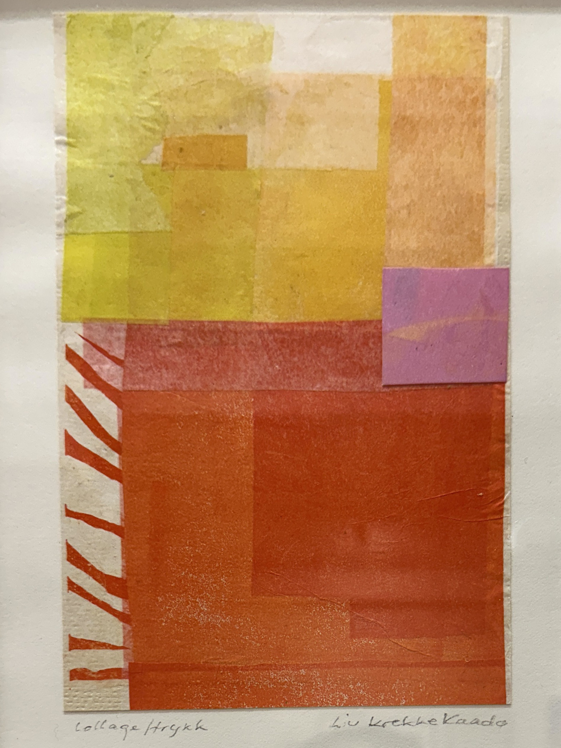 Teknikk: collage av farget papir i forskjellig tykkelser. Linoleumstrykk.